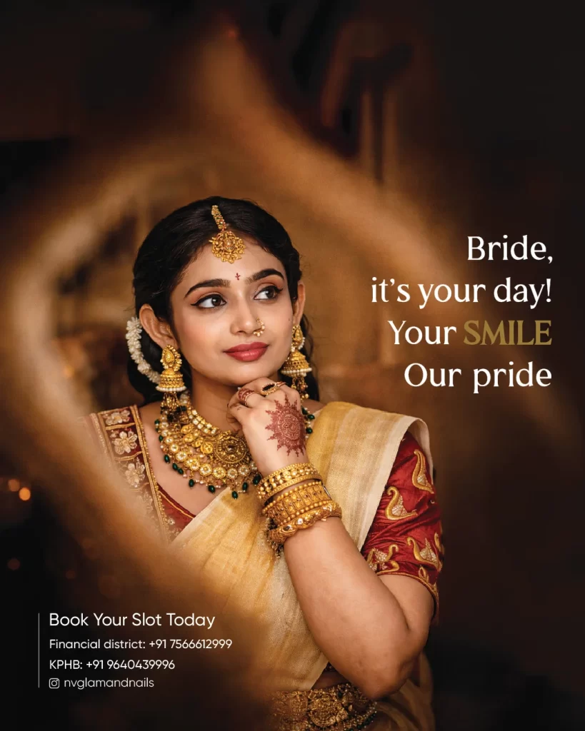 Welcome to NV Glam & Nails Where quality meets convenience. Visit our KPHB or Financial District locations, or enjoy our comprehensive home service across Hyderabad.